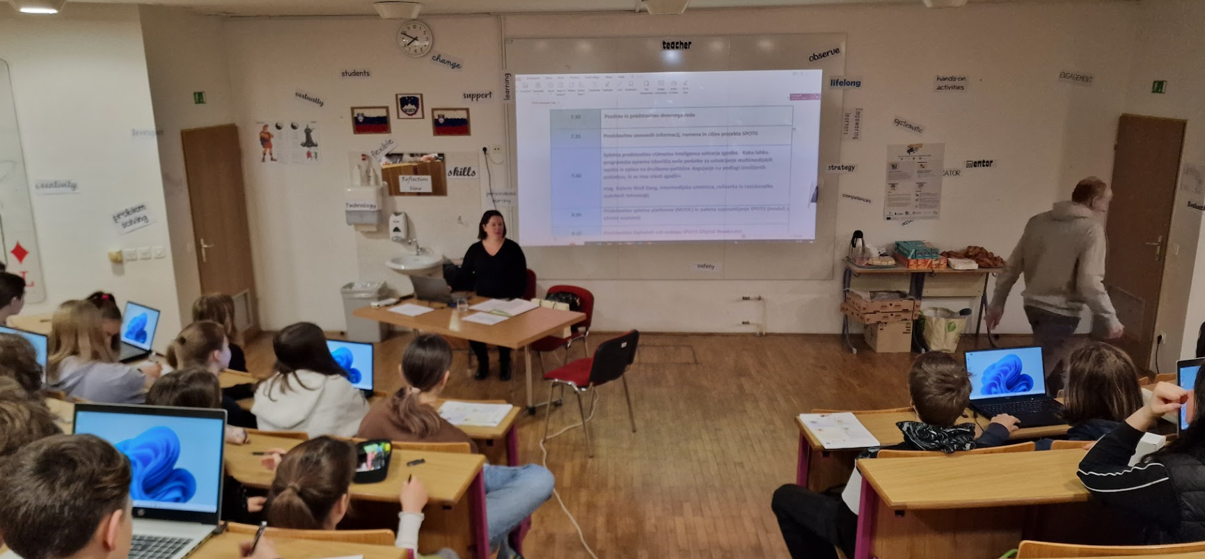We also presented the main results at the Slovenian multiplier event, which took place on January 25, 2023 at Gradec Elementary School in Litija. The event was attended by over 70 participants from various target groups of the project: young people, youth workers, teachers, public institutions, etc. The participants got acquainted with the contents of the modules and learning units in the training package and the contents of the six escape rooms, and also had the opportunity to attend an interesting online lecture by an intermedia artist, director and researcher of modern technologies, M.Sc. Valerie Wolf Gang. They also watched one of the two videos on the topic of fake news, which were produced by the Project Learning of Young Adults (PUM-O) Ljubljana group.